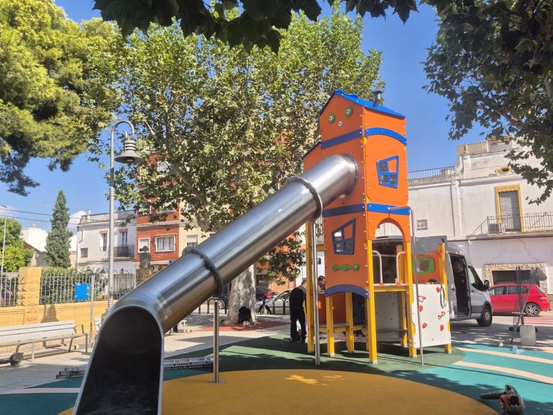 Proyecto de juegos de Galopín Playgrounds con arena instalados en Carlet. Hemos instalado este circuito de robinia con juegos y redes, y tirolina de madera de 20 metros.