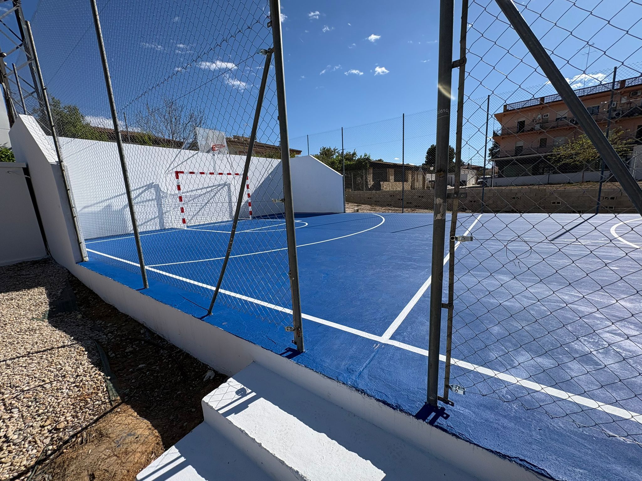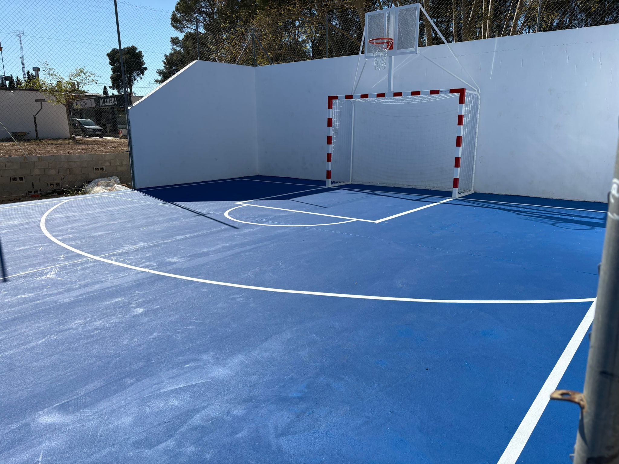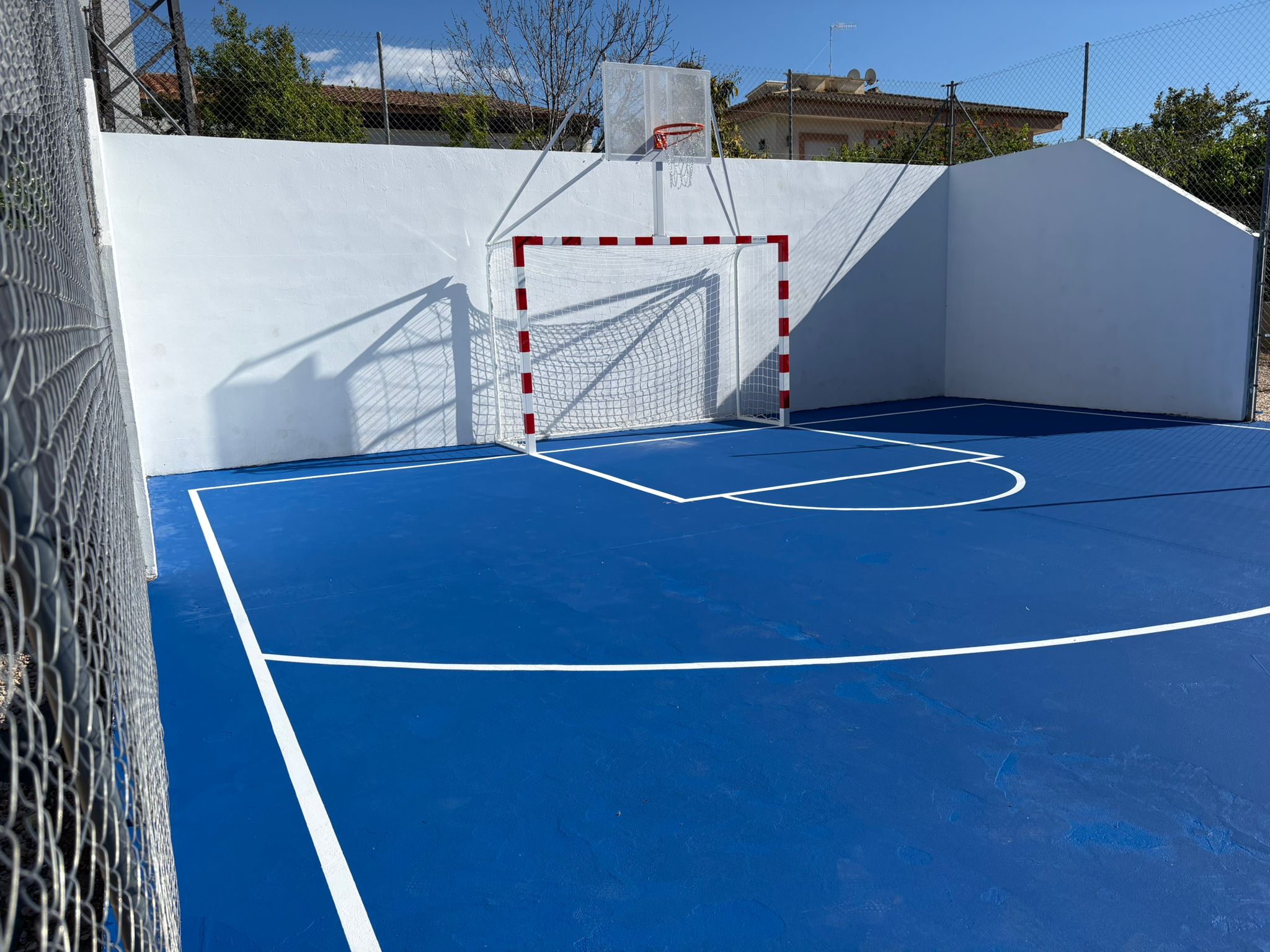 Instalación de pista multideporte con porterías y canastas, y suelo nuevo con pintada deportiva en la localidad valenciana de Godelleta.